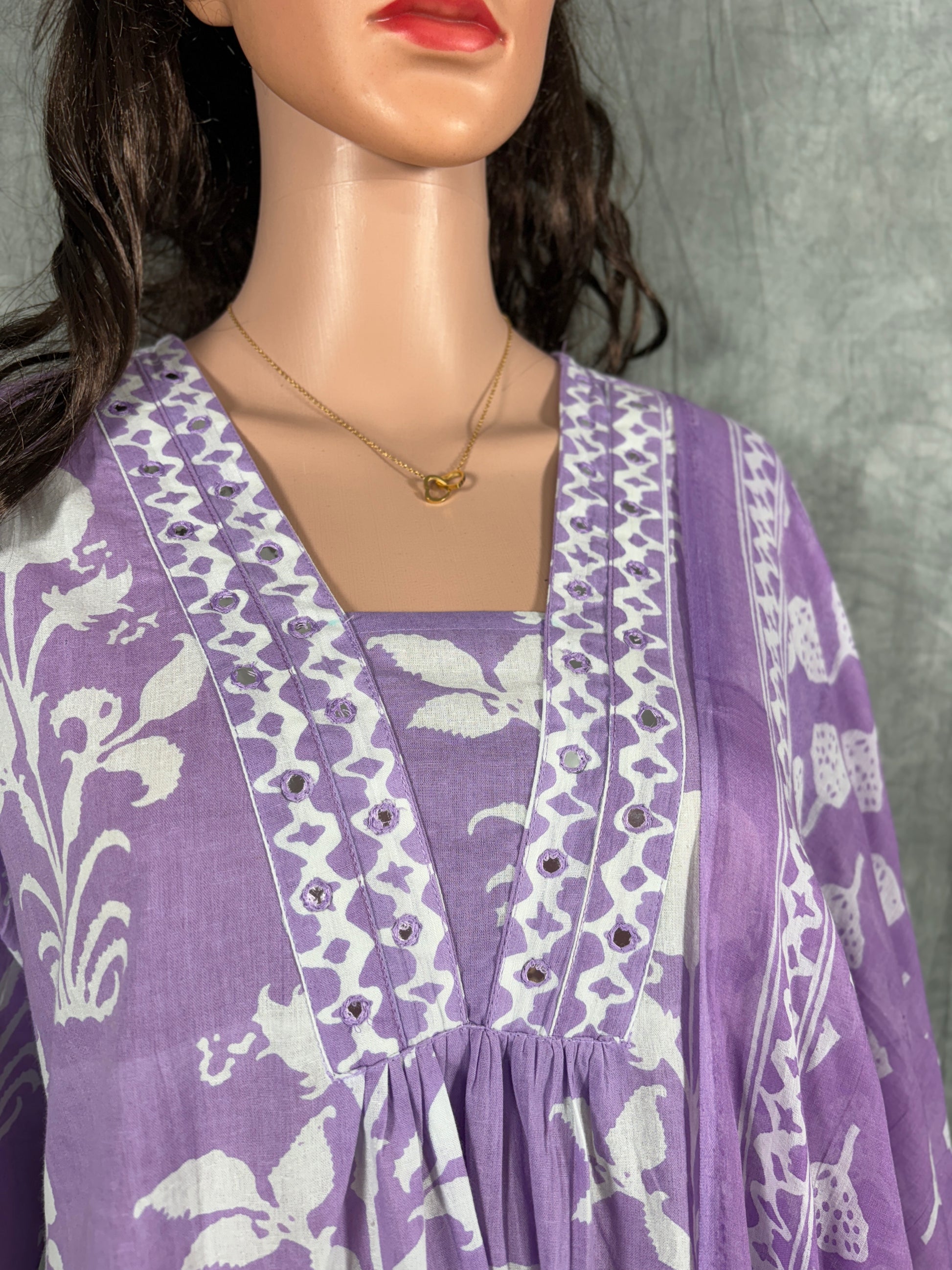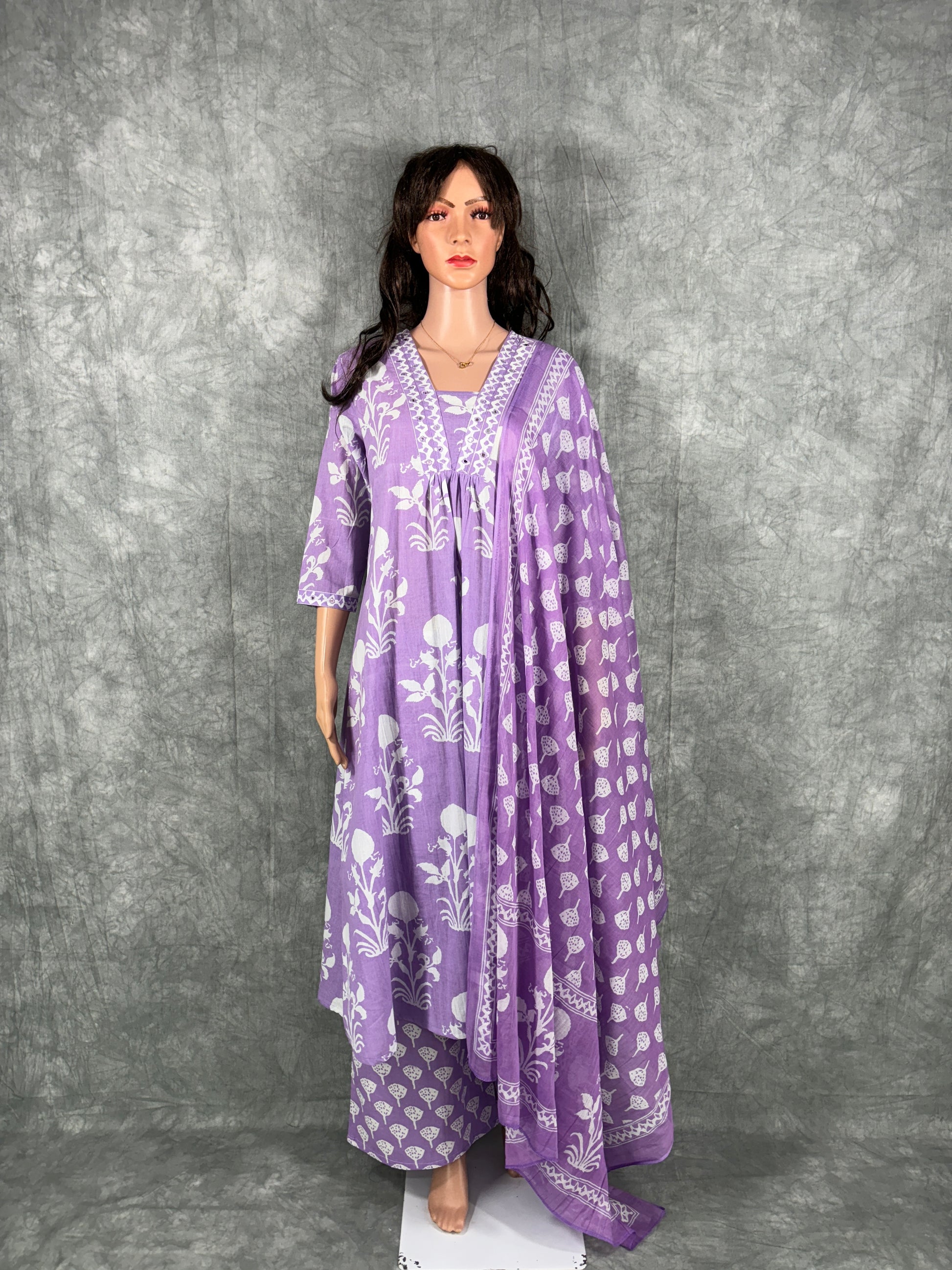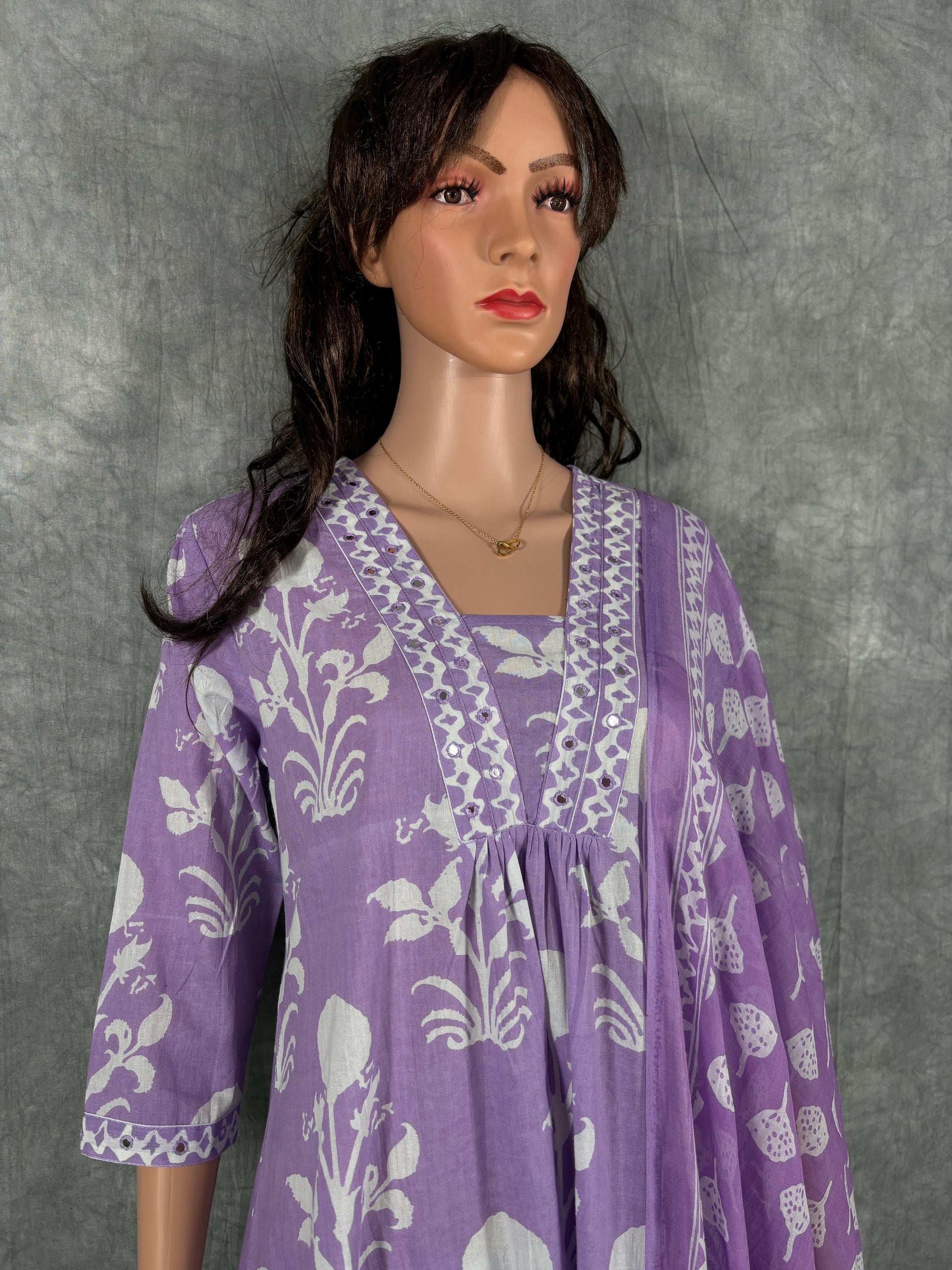 Shriya - Cotton Floral Printed Kurta with Pant and Dupatta - Lilac