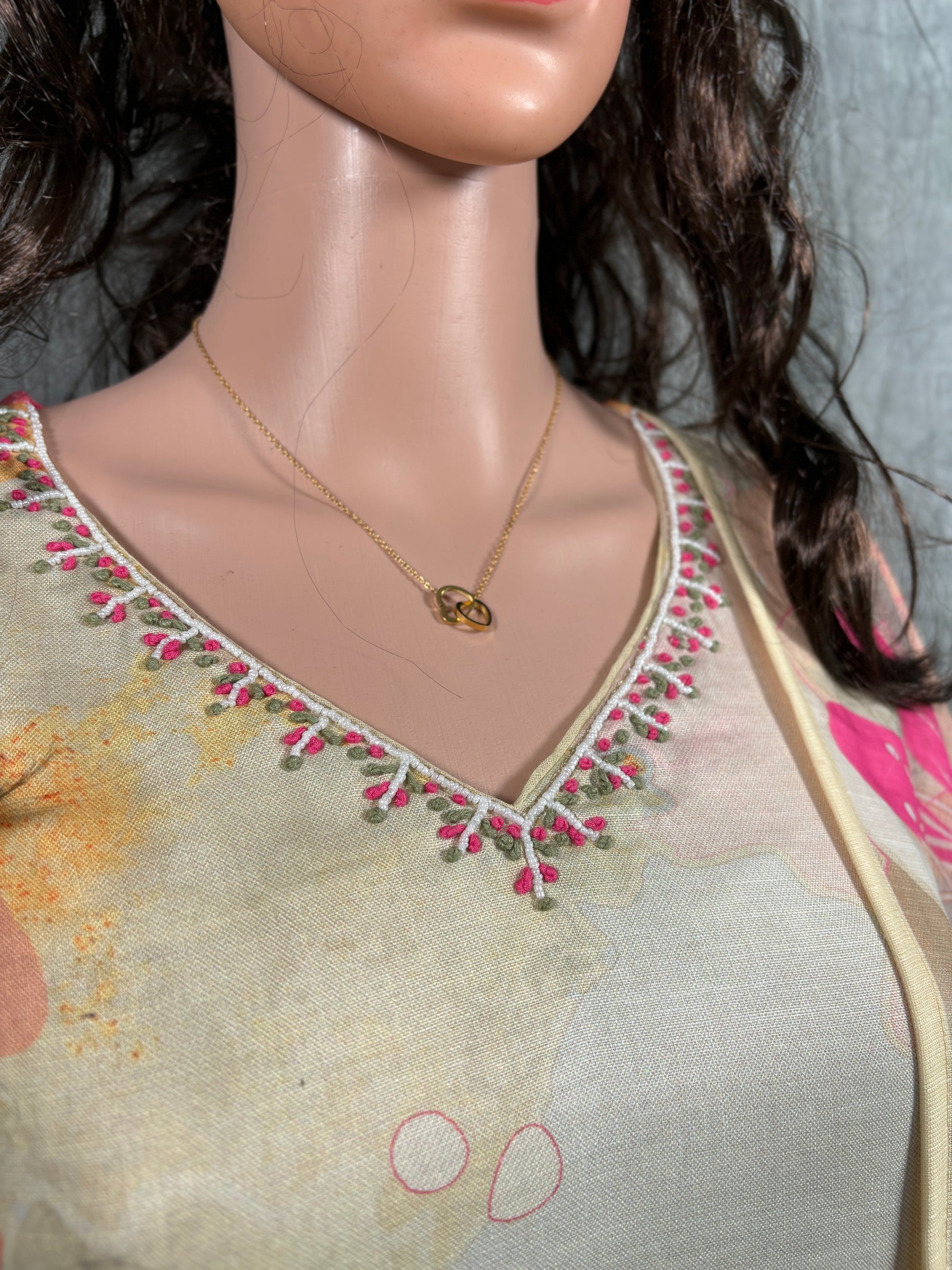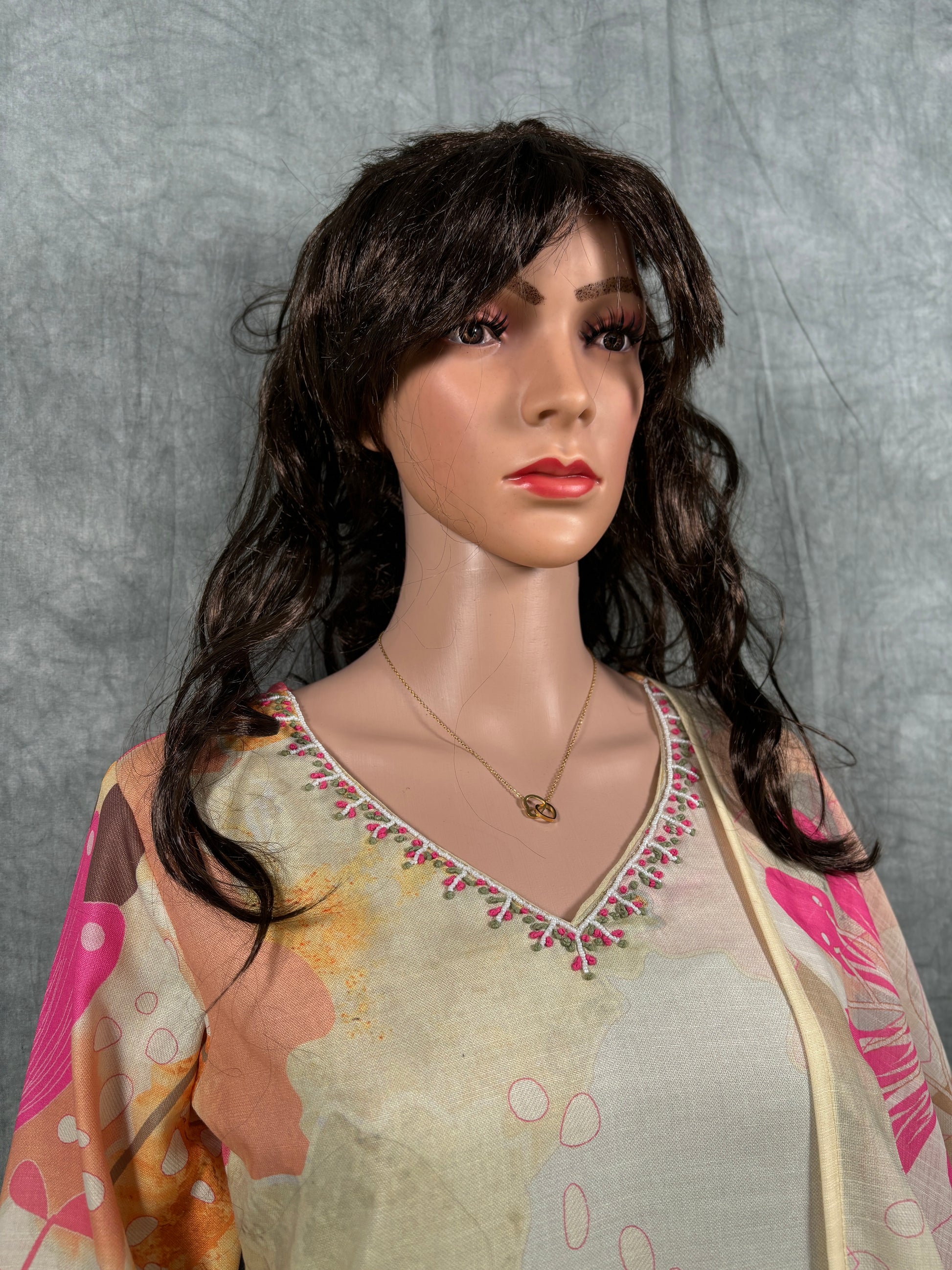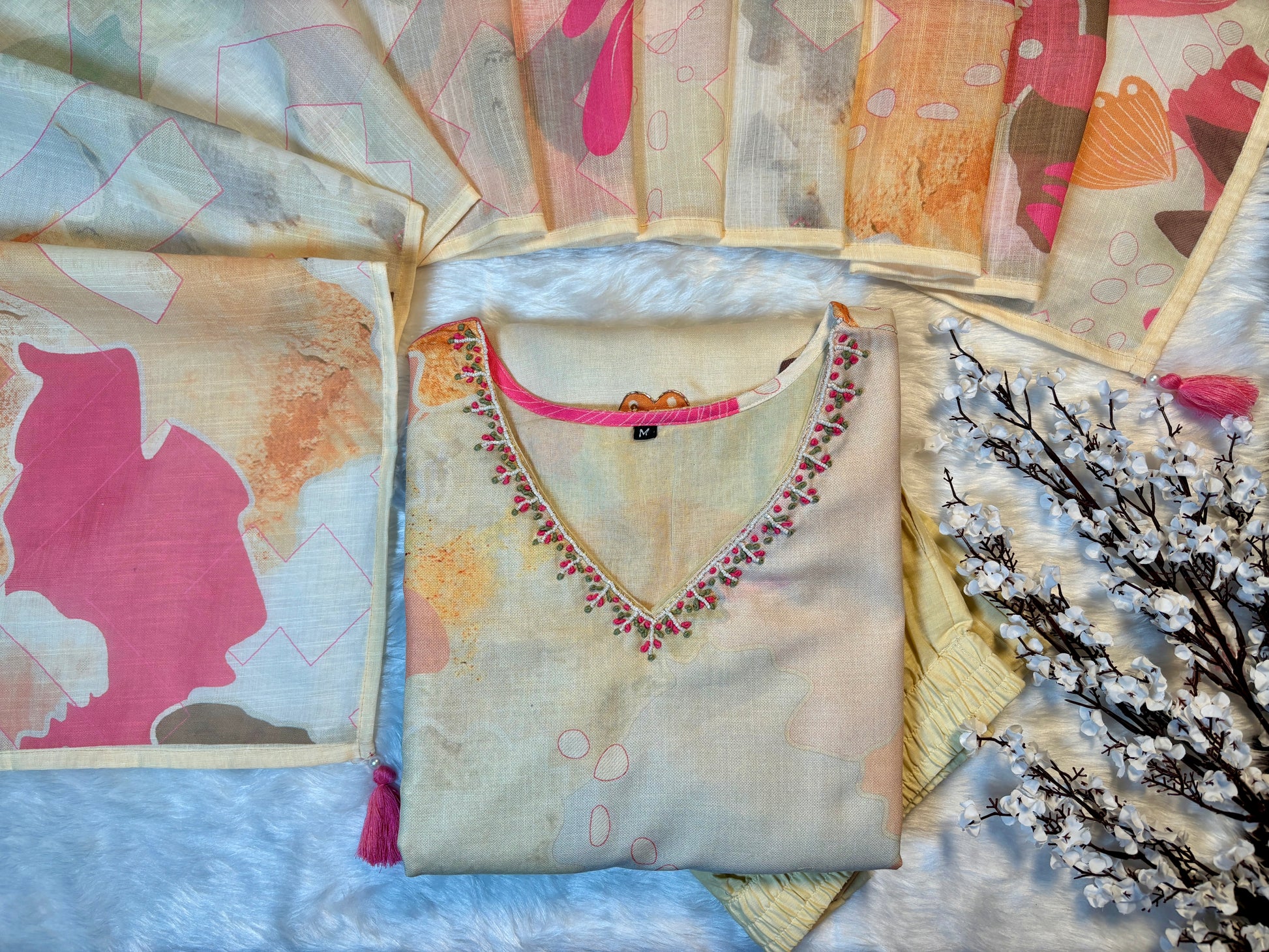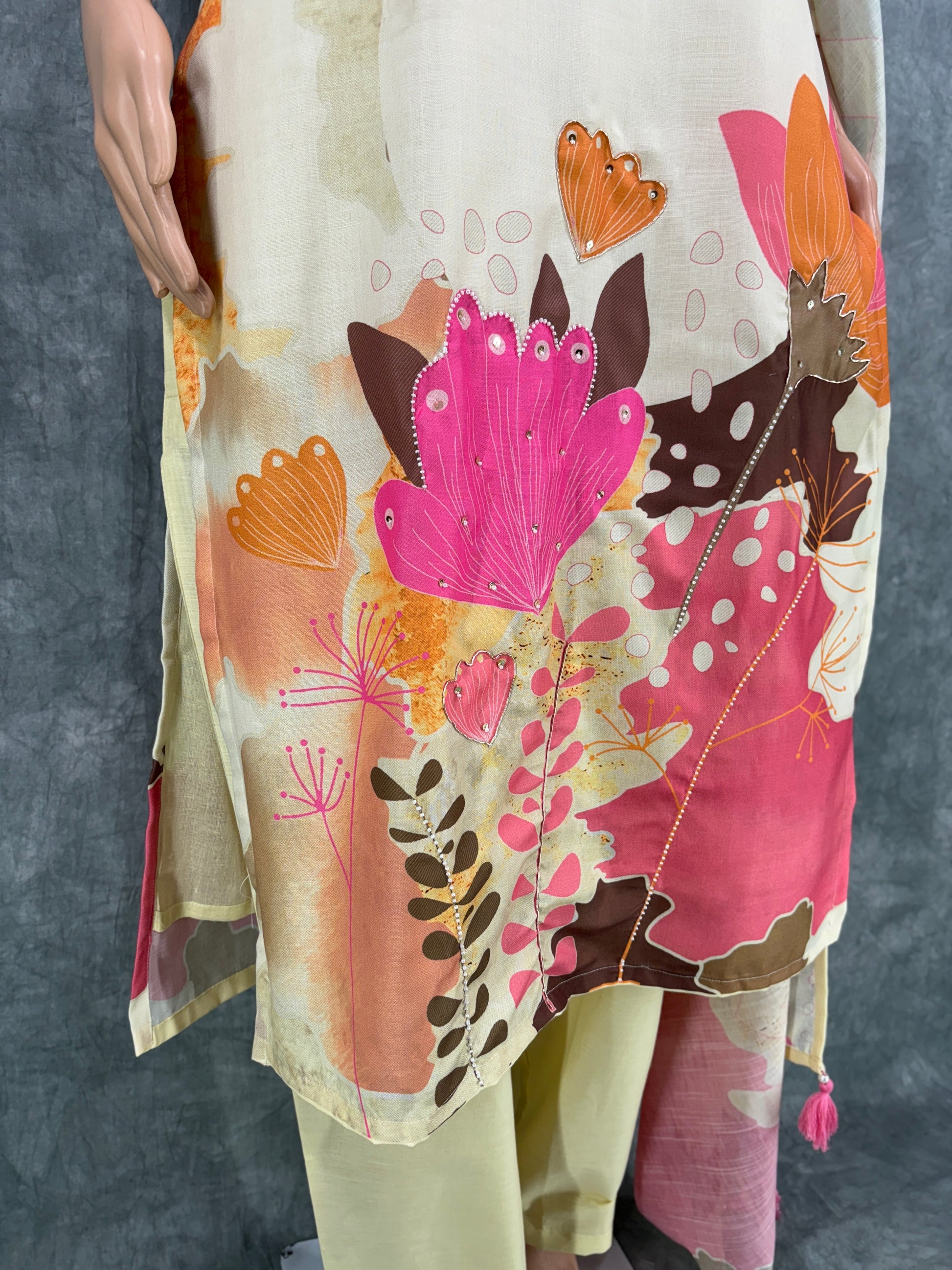 Siya - Floral Printed Hand Work Cotton Kurta with Dupatta and Pant - Off White